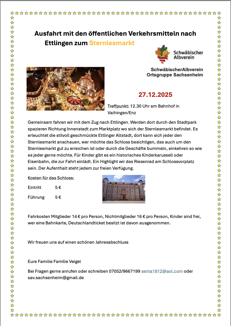 Die Ortsgruppe Sachsenheim des Schwäbischen Albvereins lädt herzlich zur gemeinsamen Ausfahrt nach Ettlingen zum stimmungsvollen Sternlesmarkt ein, um das Jahr feierlich ausklingen zu lassen.